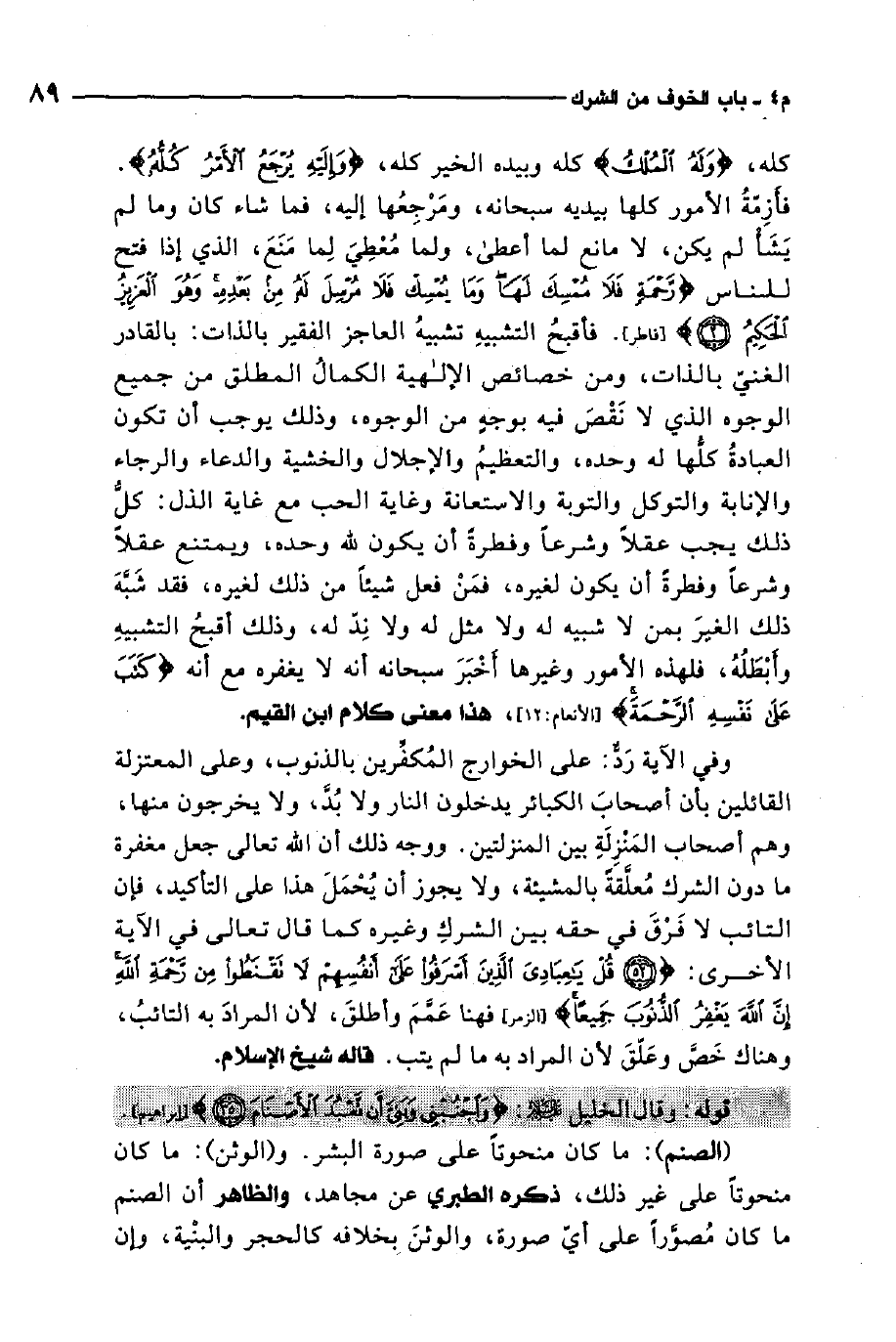 كله، {وَلَهُ الْمُلْكُ} كله وبيده الخير كله، {وَإِلَيْهِ يُرْجَعُ الْأَمْرُ كُلُّهُ} . فَأَزِمَّة الأمور كلها بيديه سبحانه، ومرجعها إليه فما شاء كان وما لم يشأ لم يكن، لا مانع لما أعطى، ولا معطي لما منع، الذي إذا فتح للناس {رَحْمَةٍ فَلا مُمْسِكَ لَهَا وَمَا يُمْسِكْ فَلا مُرْسِلَ لَهُ مِنْ بَعْدِهِ وَهُوَ الْعَزِيزُ الْحَكِيمُ} . فأقبح التشبيه تشبيه العاجز الفقير بالذات القادر الغني بالذات، ومن خصائص الإلهية الكمال المطلق من جميع الوجوه الذي لا نقص فيه بوجه من الوجه، وذلك يوجب أن تكون العبادة كلها له وحده، والتعظيم والإجلال والخشية والدعاء والرجاء والإنابة والتوكل والتوبة والاستعانة وغاية الحب مع غاية الذل، كل ذلك يجب عقلاً وشرعًا وفطرة أن يكون لله وحده، ويمتنع عقلاً وشرعًا وفطرة أن يكون لغيره، فمن فعل شيئًا من ذلك لغيره، فقد شبه ذلك الغير بمن لا شبيه له ولا مثل له ولا ند له، وذلك أقبح التشبيه وأبطله، فلهذه الأمور وغيرها أخبر سبحانه أنه لا يغفره مع أنه {كَتَبَ عَلَى نَفْسِهِ الرَّحْمَةَ} ، فهذا معنى كلام ابن القيم.