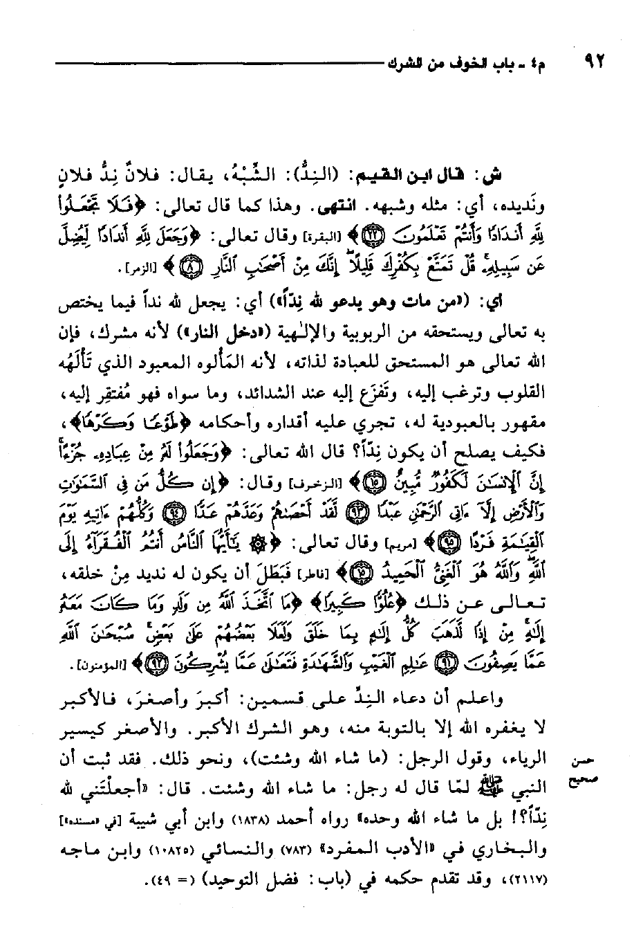 ش: قال ابن القيم: (الند) : الشبه، يقال: فلان ند فلان ونديده، أي: مثله وشبهه انتهى. وهذا كما قال تعالى: {فَلا تَجْعَلُوا لِلَّهِ أَنْدَاداً وَأَنْتُمْ تَعْلَمُونَ} 2. وقال تعالى: {وَجَعَلَ لِلَّهِ أَنْدَاداً لِيُضِلَّ عَنْ سَبِيلِهِ قُلْ تَمَتَّعْ بِكُفْرِكَ قَلِيلاً إِنَّكَ مِنْ أَصْحَابِ النَّارِ} 3.