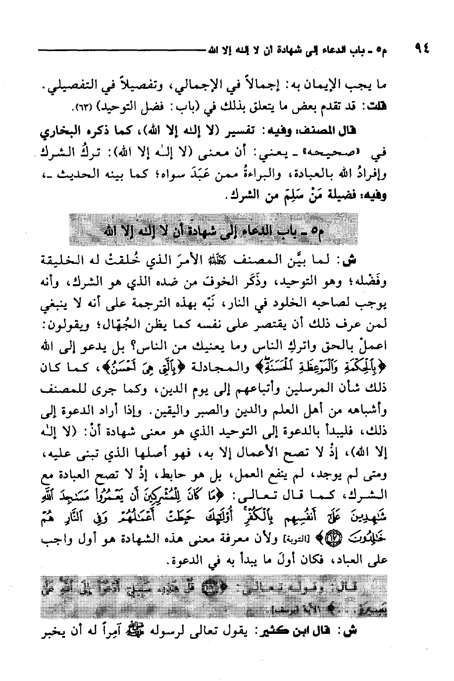 ش: لما بين المصنف رحمه الله الأمر الذي خلقت له الخليقة وفضله وهو التوحيد، وذكر الخوف من ضده الذي هو الشرك، وأنه يوجب لصاحبه الخلود في النار، نبّه بهذه الترجمة على أنه لا ينبغي لمن عرف ذلك أن يقتصر على نفسه كما يظن الجهال; ويقولون: اعمل بالحق واترك الناس وما يعنيك من الناس، بل يدعو إلى الله {بِالْحِكْمَةِ وَالْمَوْعِظَةِ الْحَسَنَةِ} والمجادلة {بِالَّتِي هِيَ أَحْسَنُ} ، كما كان ذلك شأن المرسلين وأتباعهم إلى يوم الدين، وكما جرى للمصنف وأشباهه من أهل العلم والدين والصبر واليقين.