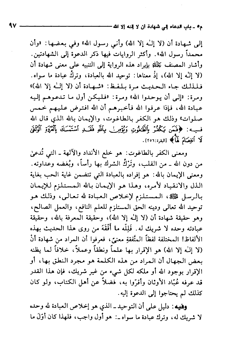 وأشار المصنف رحمه الله بإيراد هذه الرواية إلى التنبيه على معنى شهادة أن لا إله إلا الله، إذ معناها توحيد الله بالعبادة، وترك عبادة ما سواه. فلذلك جاء الحديث مرة بلفظ "شهادة أن لا إله إلا الله" ومرة "إلى أن يوحدوا الله". ومرة "فليكن أول ما تدعوهم إليه عبادة الله، فإذا عرفوا الله فأخبرهم أن الله افترض عليهم خمس صلوات" 2. وذلك هو الكفر بالطاغوت، والإيمان بالله الذي قال الله فيه: {فَمَنْ يَكْفُرْ بِالطَّاغُوتِ وَيُؤْمِنْ بِاللَّهِ فَقَدِ اسْتَمْسَكَ بِالْعُرْوَةِ الْوُثْقَى لا انْفِصَامَ لَهَا} 3.