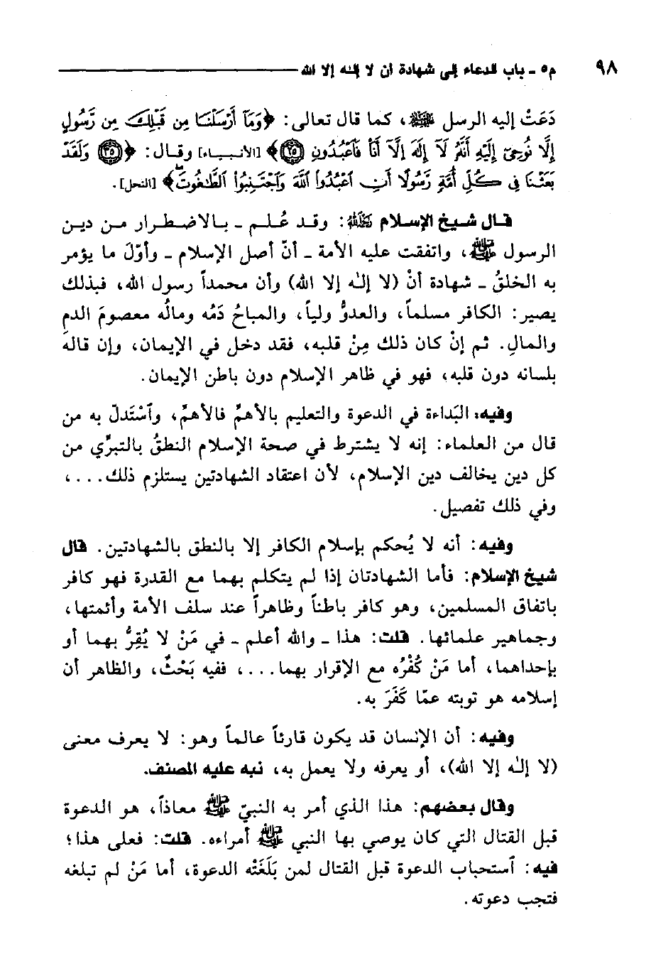 وفيه: أنه لا يحكم بإسلام الكافر إلا بالنطق بالشهادتين. قال شيخ الإسلام: فأما الشهادتان إذا لم يتكلم بهما مع القدرة فهو كافر باتفاق المسلمين، وهو كافر باطنًا وظاهرًا عند سلف الأمة وأئمتها، وجماهير علمائها.