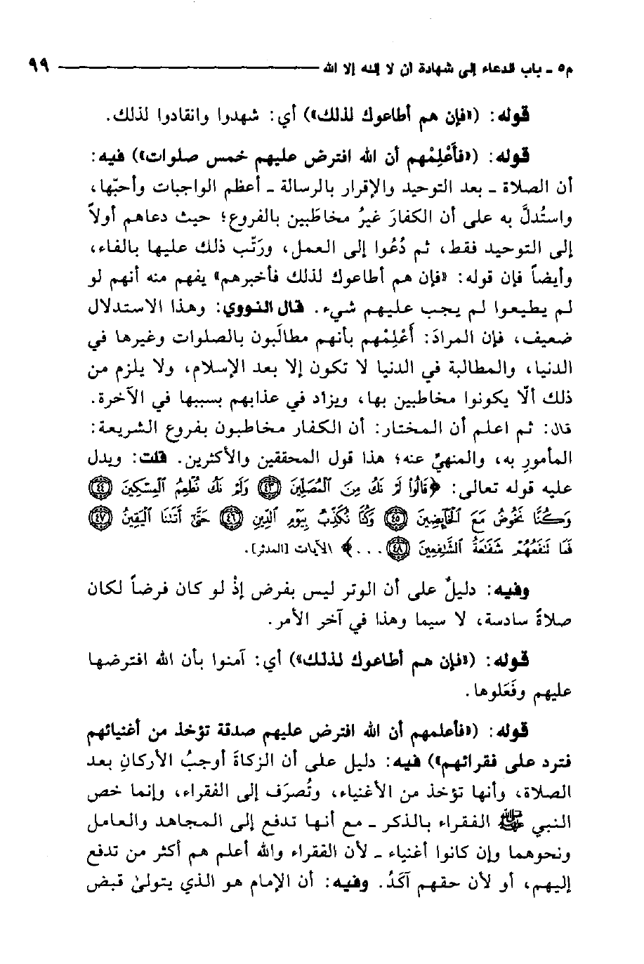 قال النووي: وهذا الاستدلال ضعيف، فإن المراد أعلمهم بأنهم مطالبون بالصلوات وغيرها في الدنيا، والمطالبة في الدنيا لا تكون إلا بعد الإسلام، ولا يلزم من ذلك أن لا يكونوا مخاطبين بها، ويزاد في عذابهم بسببها في الآخرة، قال: ثم اعلم أن المختار أنّ الكفار مخاطبون بفروع الشريعة المأمور به والمنهي عنه، هذا قول المحققين والأكثرين.