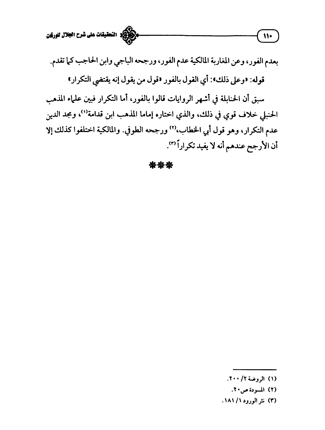 سبق أن الحنابلة في أشهر الروايات قالوا بالفور، أما التكرار فبين علماء المذهب الحنبلي خلاف قوي في ذلك، والذي اختاره إماما المذهب ابن قدامة (¬١)، ومجد الدين عدم التكرار، وهو قول أبي الخطاب، (¬٢) ورجحه الطوفي. والمالكية اختلفوا كذلك إلا أن الأرجح عندهم أنه لا يفيد تكراراً (¬٣).