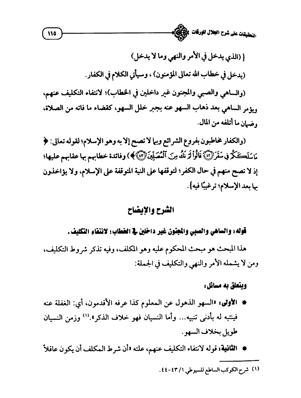 والساهي والصبي والمجنون، غير داخلين في الخطاب، لانتفاء التكليف عنهم. ويؤمر الساهي بعد ذهاب السهو عنه بجبر خلل السهو، كقضاء ما فاته من الصلاة، وضمان ما أتلفه من المال عنهم ... الخ: