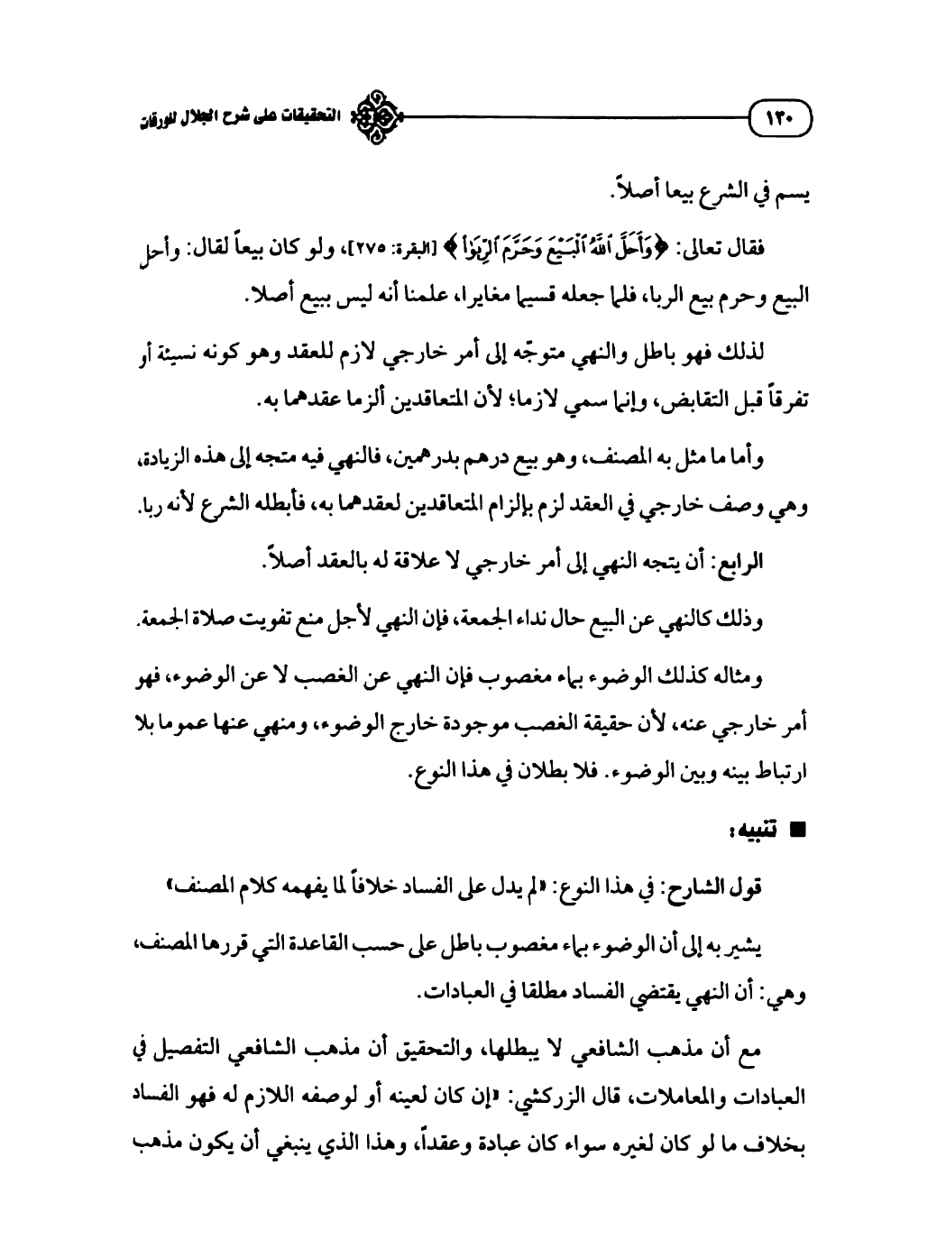 مع أن مذهب الشافعي لا يبطلها، والتحقيق أن مذهب الشافعي التفصيل في العبادات والمعاملات، قال الزركشي: "إن كان لعينه أو لوصفه اللازم له فهو الفساد بخلاف ما لو كان لغيره سواء كان عبادة وعقداً، وهذا الذي ينبغي أن يكون مذهب