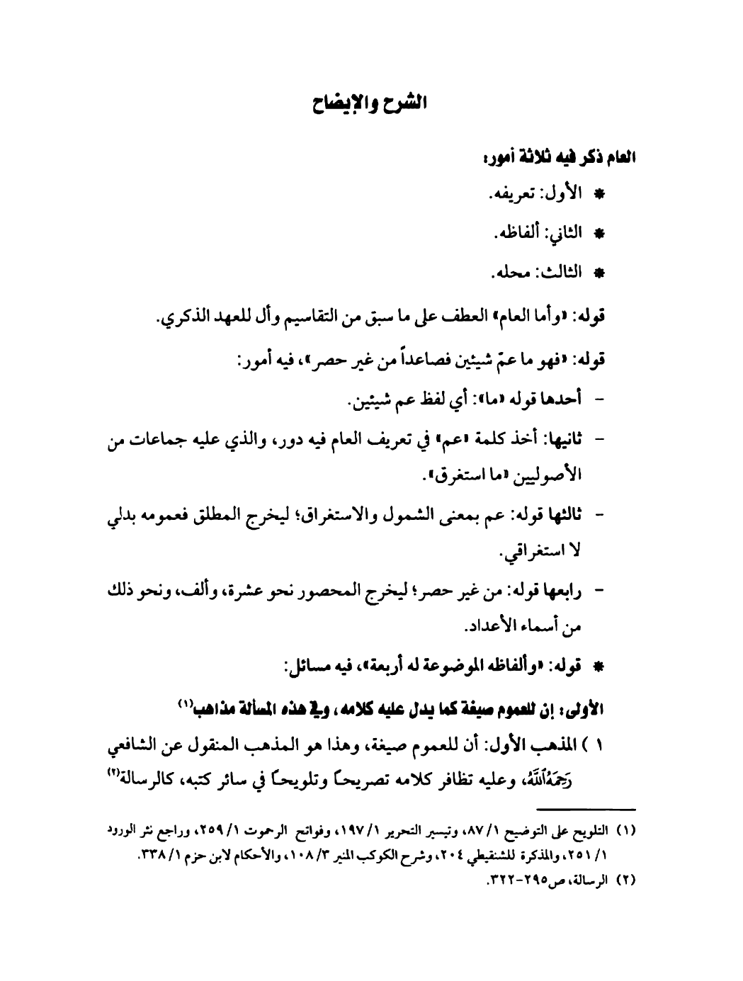 العام ذكر فيه ثلاثة أمور: الأول: تعريفه، الثاني: ألفاظه، الثالث: محله.