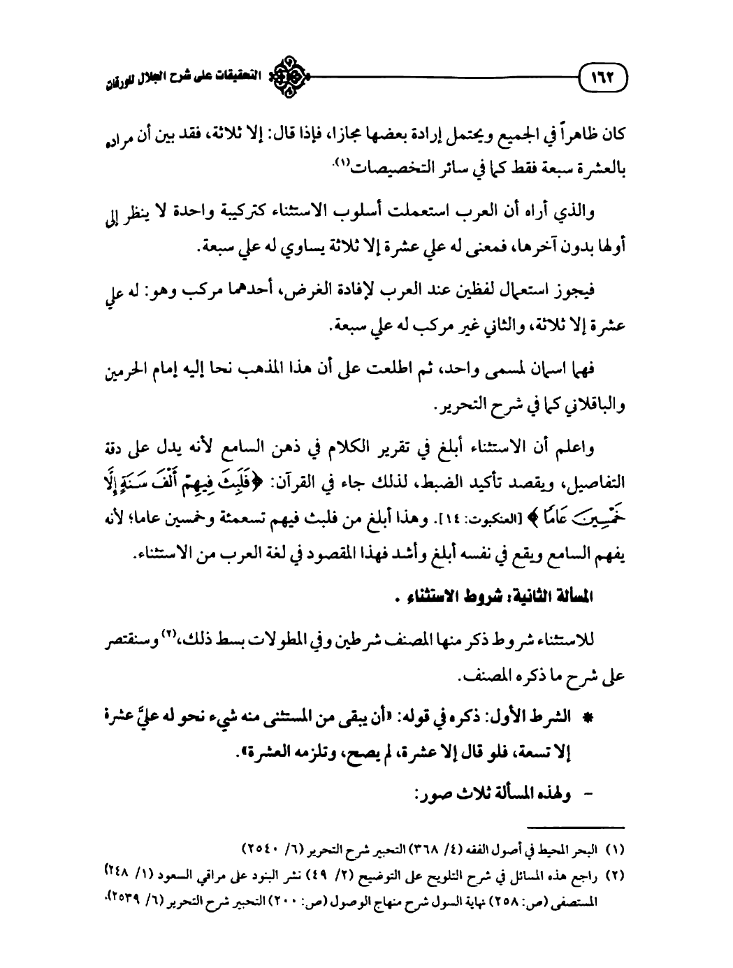 للاستثناء شروط ذكر منها المصنف شرطين وفي المطولات بسط ذلك، (¬٢) وسنقتصر على شرح ما ذكره المصنف.