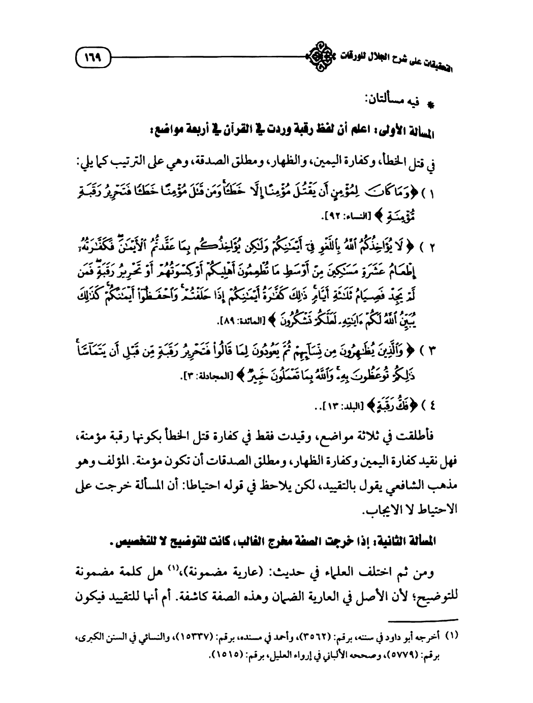 فأطلقت في ثلاثة مواضع، وقيدت فقط في كفارة قتل الخطأ بكونها رقبة مؤمنة، فهل نقيد كفارة اليمين وكفارة الظهار، ومطلق الصدقات أن تكون مؤمنة. المؤلف وهو مذهب الشافعي يقول بالتقييد، لكن يلاحظ في قوله احتياطا: أن المسألة خرجت على الاحتياط لا الايجاب.