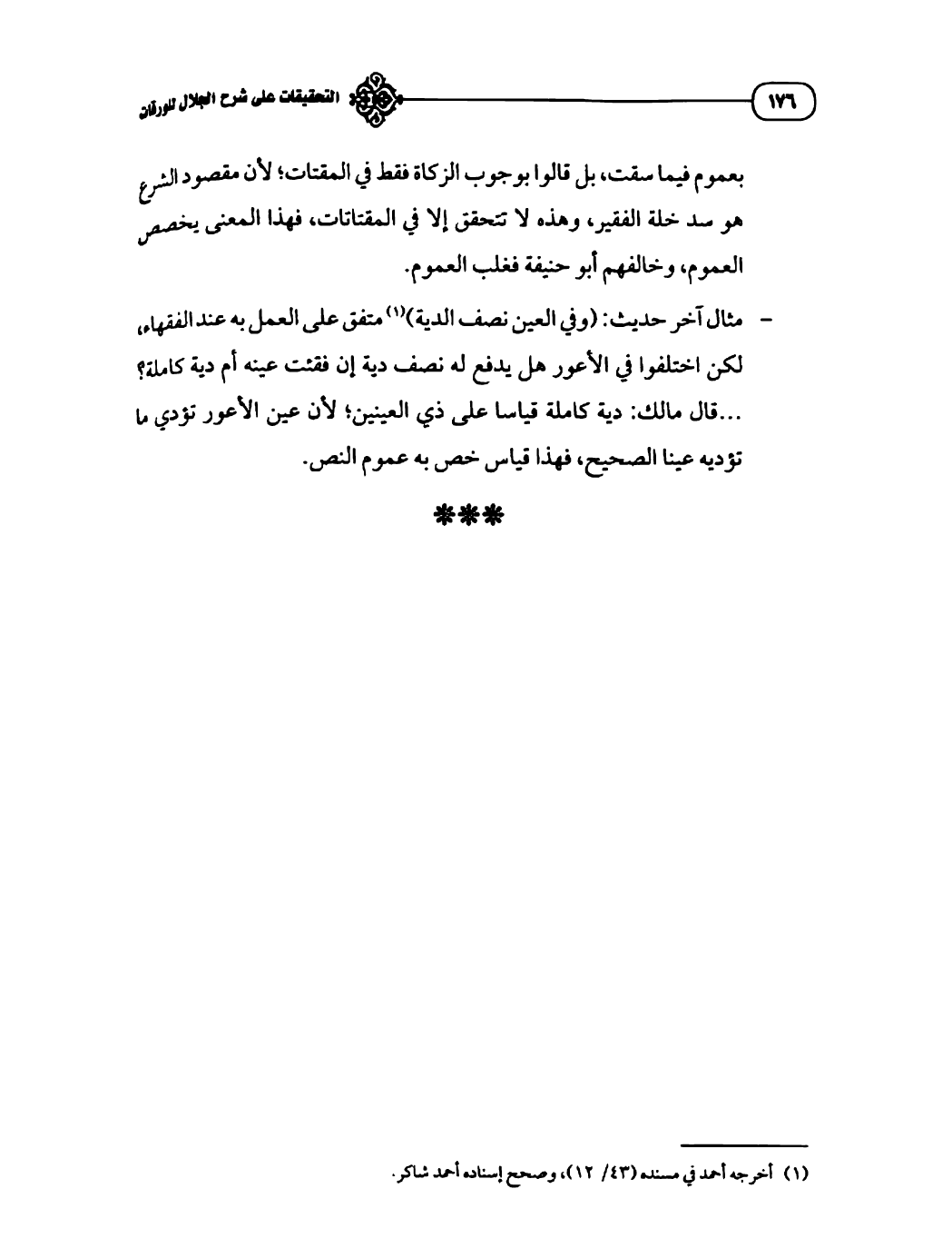 - مثال آخر حديث: (وفي العين نصف الدية) (¬١) متفق على العمل به عند الفقهاء، لكن اختلفوا في الأعور هل يدفع له نصف دية إن فقئت عينه أم دية كاملة؟ ... قال مالك: دية كاملة قياسا على ذي العينين؛ لأن عين الأعور تؤدي ما تؤديه عينا الصحيح، فهذا قياس خص به عموم النص.