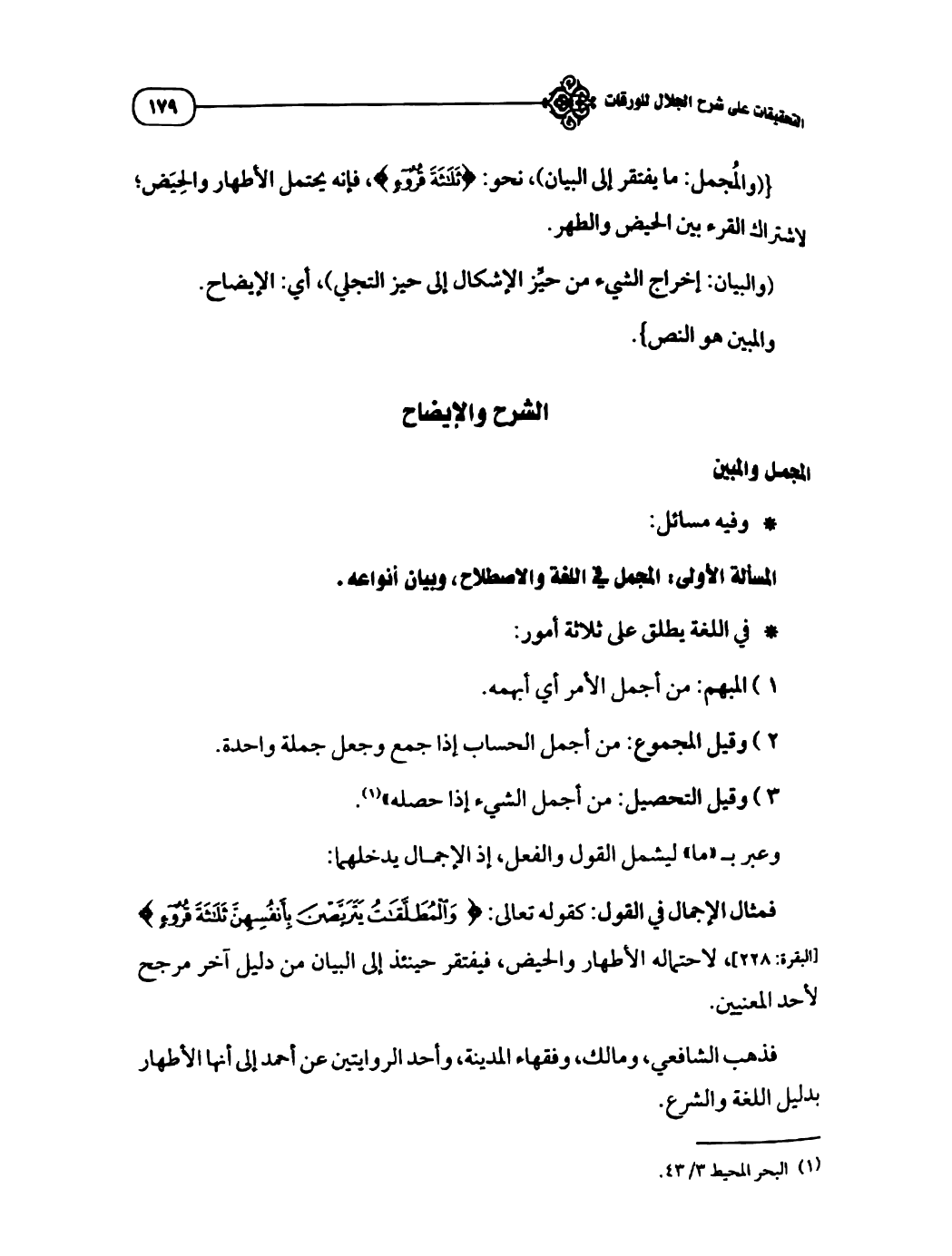 والمجمل ما يفتقر إلى البيان، نحو: {ثَلَاثَةَ قُرُوءٍ} فإنه يحتمل الأطهار والحيض؛ لاشتراك القرء بين الحيض والطهر.