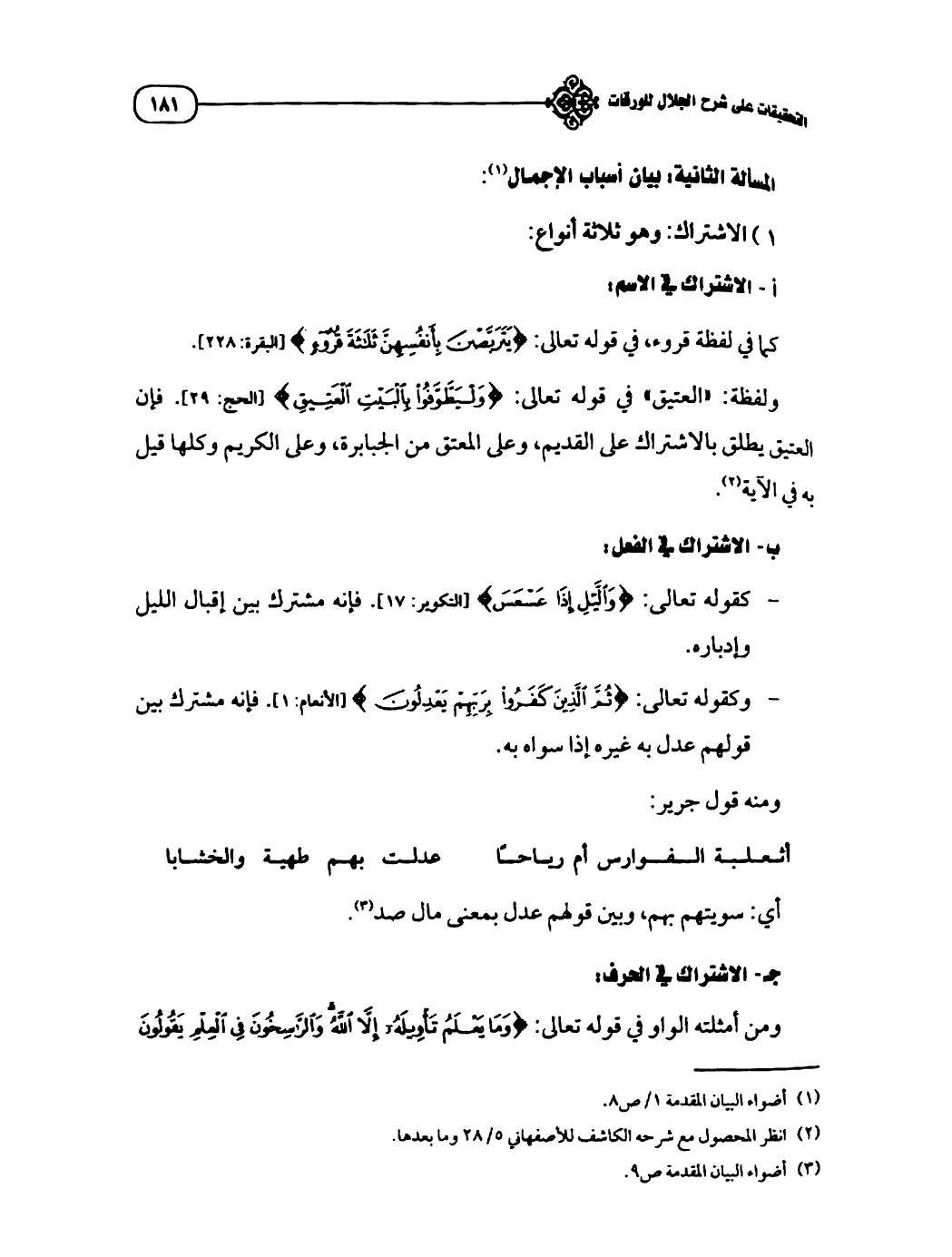 ولفظة: "العتيق" في قوله تعالى: {وَلْيَطَّوَّفُوا بِالْبَيْتِ الْعَتِيقِ} [الحج: ٢٩]. فإن العتيق يطلق بالاشتراك على القديم، وعلى المعتق من الجبابرة، وعلى الكريم وكلها قيل به في الآية (¬٢).