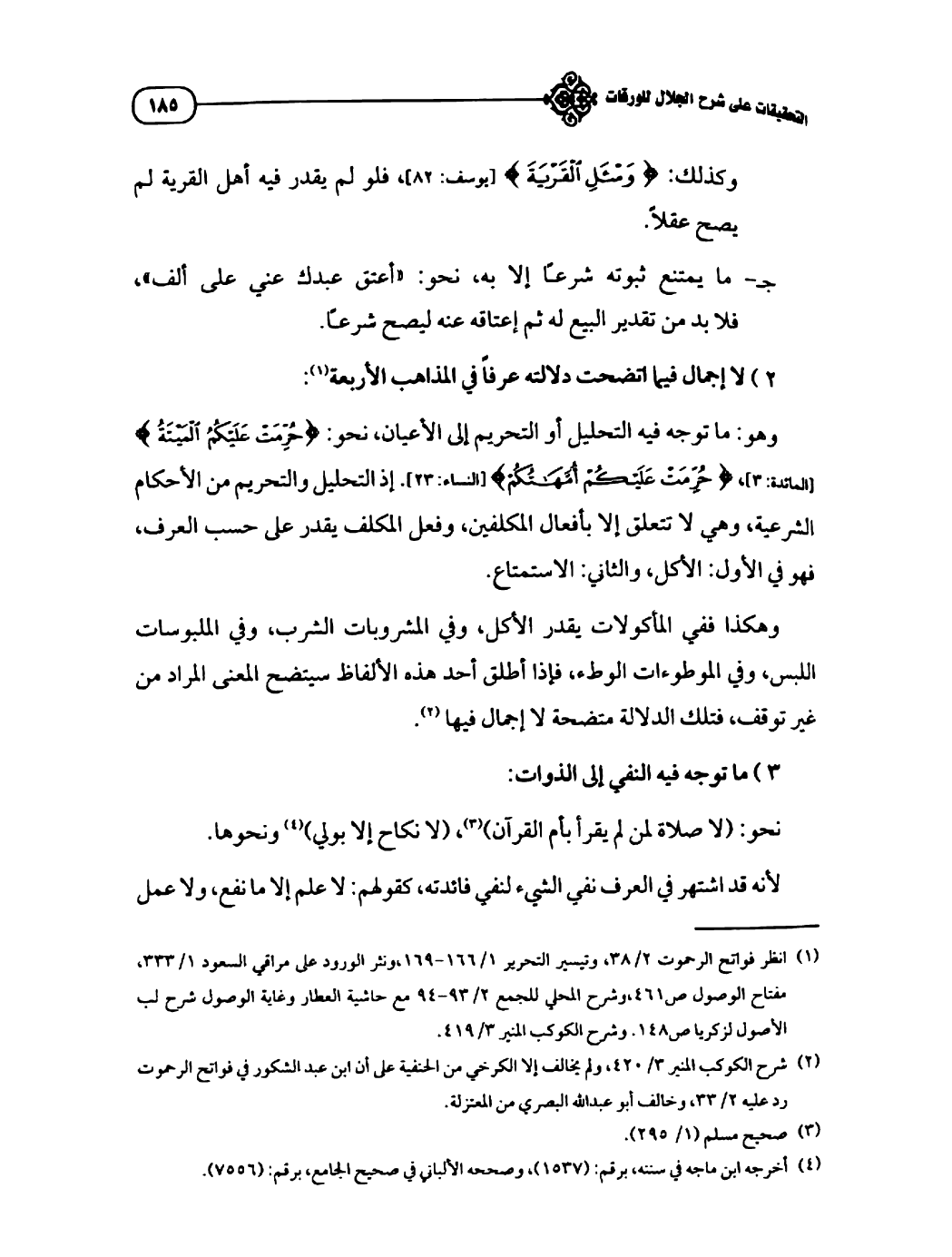 (¬١) انظر فواتح الرحموت ٢/ ٣٨، وتيسير التحرير ١/ ١٦٦ - ١٦٩، ونثر الورود على مراقي السعود ١/ ٣٣٣، مفتاح الوصول ص ٤٦١، وشرح المحلى للجمع ٢/ ٩٣ - ٩٤ مع حاشية العطار وغاية الوصول شرح لب الأصول لزكريا ص ١٤٨. وشرح الكوكب المنير ٣/ ٤١٩.