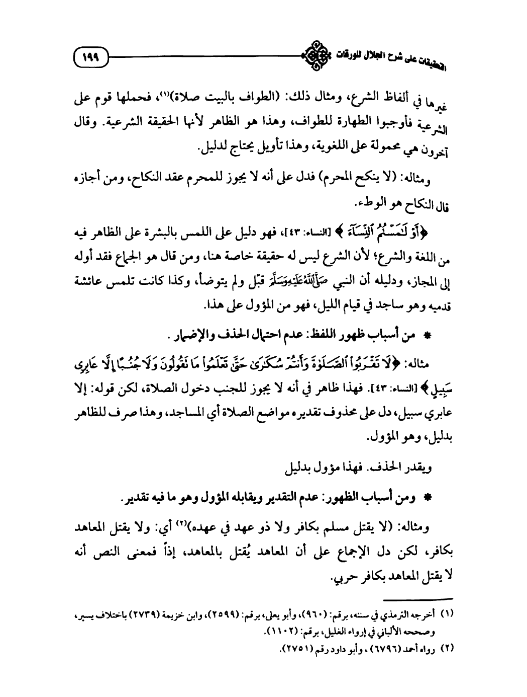 ومثاله: (لا ينكح المحرم) فدل على أنه لا يجوز للمحرم عقد النكاح، ومن أجازه قال النكاح هو الوطء: {أَوْ لَامَسْتُمُ النِّسَاءَ} [النساء: ٤٣]، فهو دليل على اللمس بالبشرة على الظاهر فيه من اللغة والشرع؛ لأن الشرع ليس له حقيقة خاصة هنا، ومن قال هو الجماع فقد أوله إلى المجاز، ودليله أن النبي صلى الله عليه وسلم قبّل ولم يتوضأ، وكذا كانت تلمس عائشة قدميه وهو ساجد في قيام الليل، فهو من المؤول على هذا.