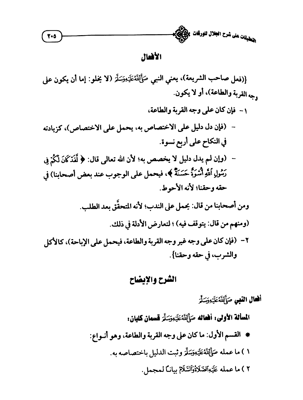 فعل صاحب الشريعة يعني النبي - صَلَّى اللهُ عَلَيْهِ وَسَلَّمَ - لا يخلو إما أن يكون على وجه القربة والطاعة أو لا يكون.