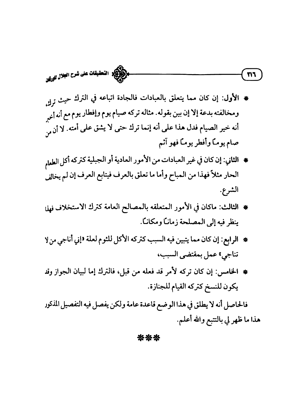 الأول: إن كان مما يتعلق بالعبادات فالجادة إتباعه في الترك حيث ترك، ومخالفته بدعة إلا إن بين بقوله. مثاله تركه صيام يوم وإفطار يوم مع أنه أخبر أنه خير الصيام فدل هذا على أنه إنما ترك حتى لا يشق على أمته. لا أن من صام يوما وأفطر فهو آثم