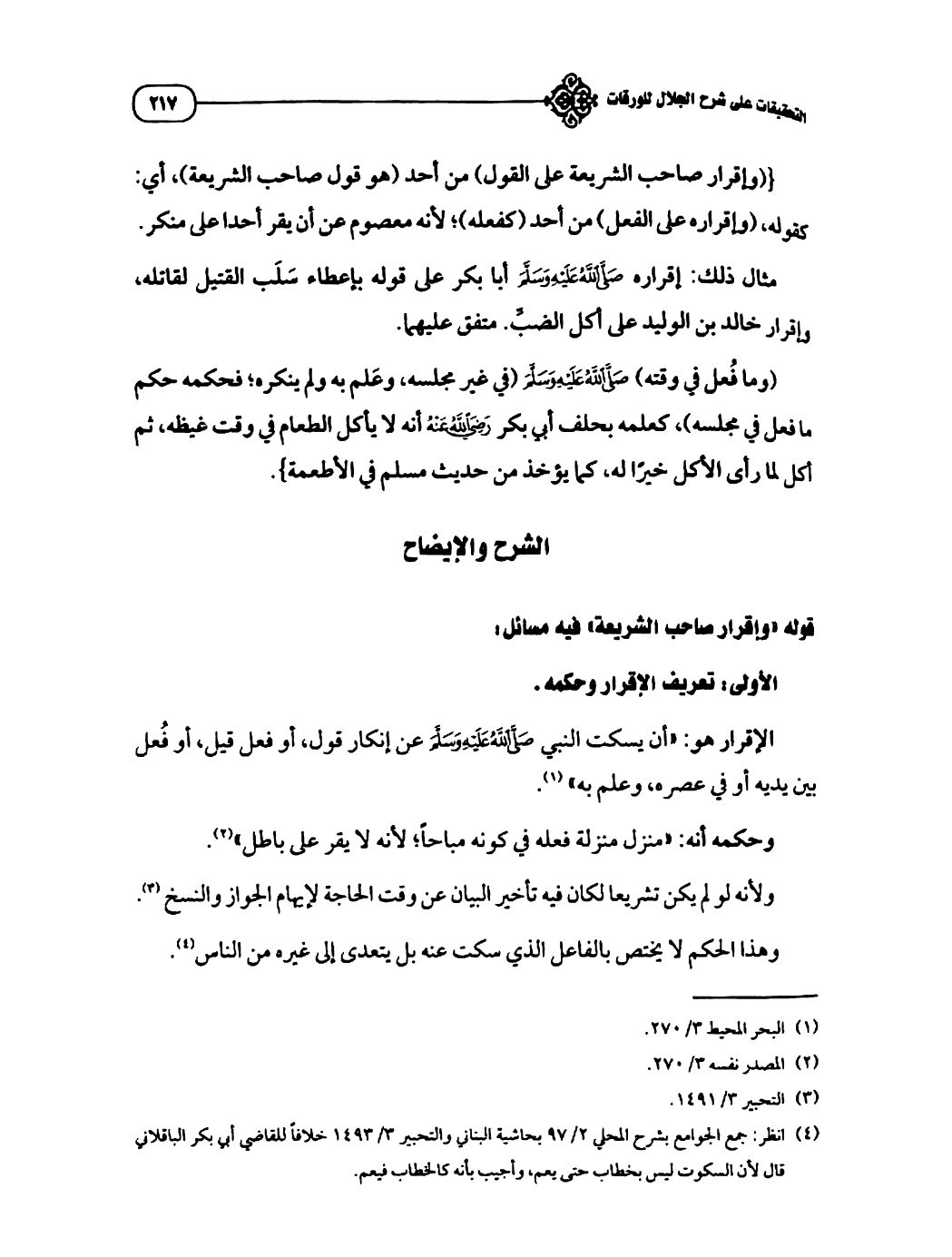 وإقراره على الفعل من أحد كفعله، لأنه معصوم عن أن يقر أحداً على منكر، مثال ذلك إقراره - صَلَّى اللهُ عَلَيْهِ وَسَلَّمَ - أبا بكر على قوله بإعطاء سلب القتيل لقاتله.
