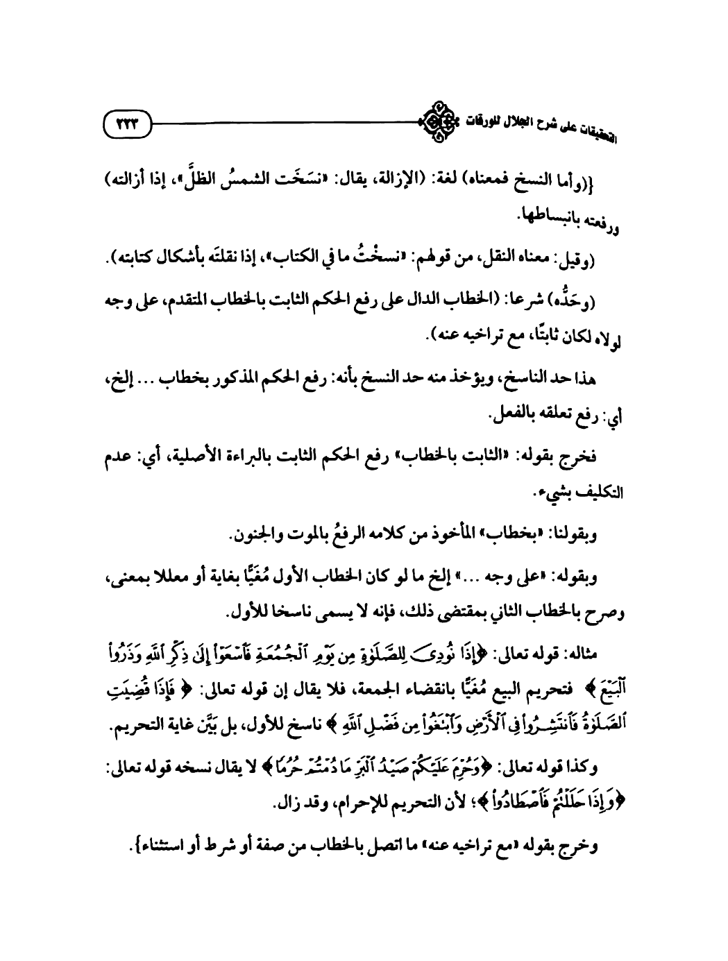 وحدُّه شرعاً الخطاب الدال على رفع الحكم الثابت بالخطاب المتقدم على وجه لولاه لكان ثابتاً مع تراخيه عنه هذا حد للناسخ.