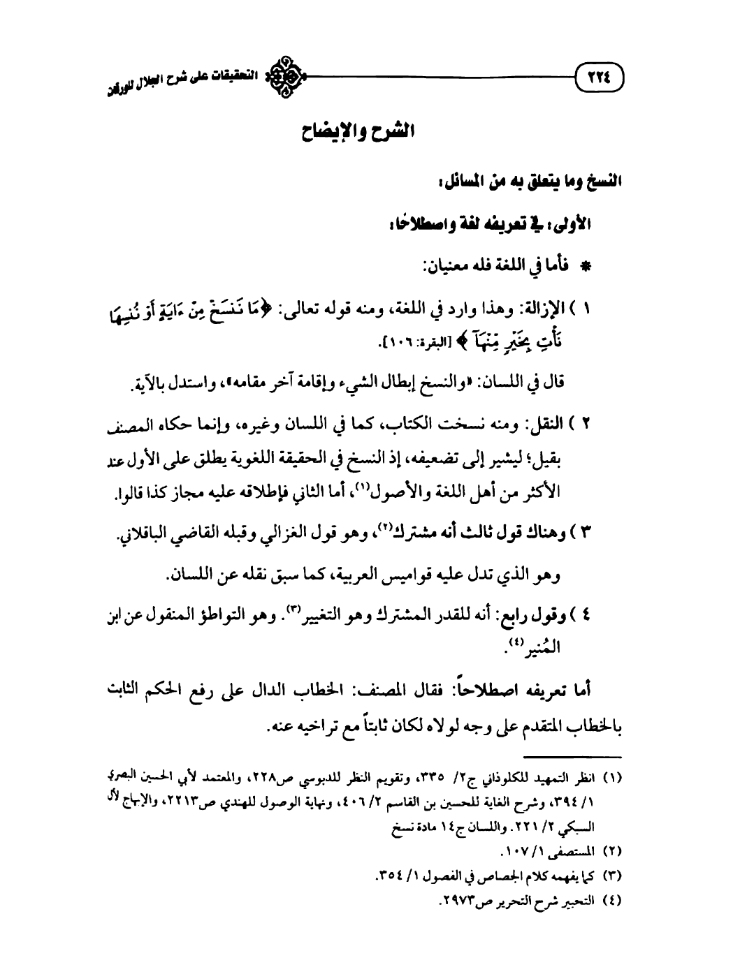 (¬١) انظر التمهيد للكلوذاني ج ٢/ ٣٣٥، وتقويم النظر للدبوسي ص ٢٢٨، والمعتمد لأبي الحسين البصري ١/ ٣٩٤، وشرح الغاية للحسين بن القاسم ٢/ ٤٠٦، ونهاية الوصول للهندي ص ٢٢١٣، والإبهاج لآل السبكي ٢/ ٢٢١. واللسان ج ١٤ مادة نسخ