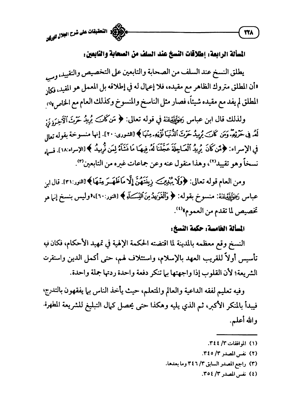 ولذلك قال ابن عباس رضي الله عنه في قوله تعالى: {مَنْ كَانَ يُرِيدُ حَرْثَ الآخِرَةِ نَزِدْ لَهُ فِي حَرْثِهِ وَمَنْ كَانَ يُرِيدُ حَرْثَ الدُّنْيَا نُؤتِهِ مِنْهَا}. [الشورى: ٢٠]. إنها منسوخة بقوله تعالى في الإسراء: {مَنْ كَانَ يُرِيدُ الْعَاجِلَةَ عَجَّلْنَا لَهُ فِيهَا مَا نَشَاءُ لِمَنْ نُرِيدُ} [الإسراء: ١٨]. فسماه نسخاً وهو تقييد (¬٢)، وهذا منقول عنه وعن جماعات غيره من التابعين (¬٣).