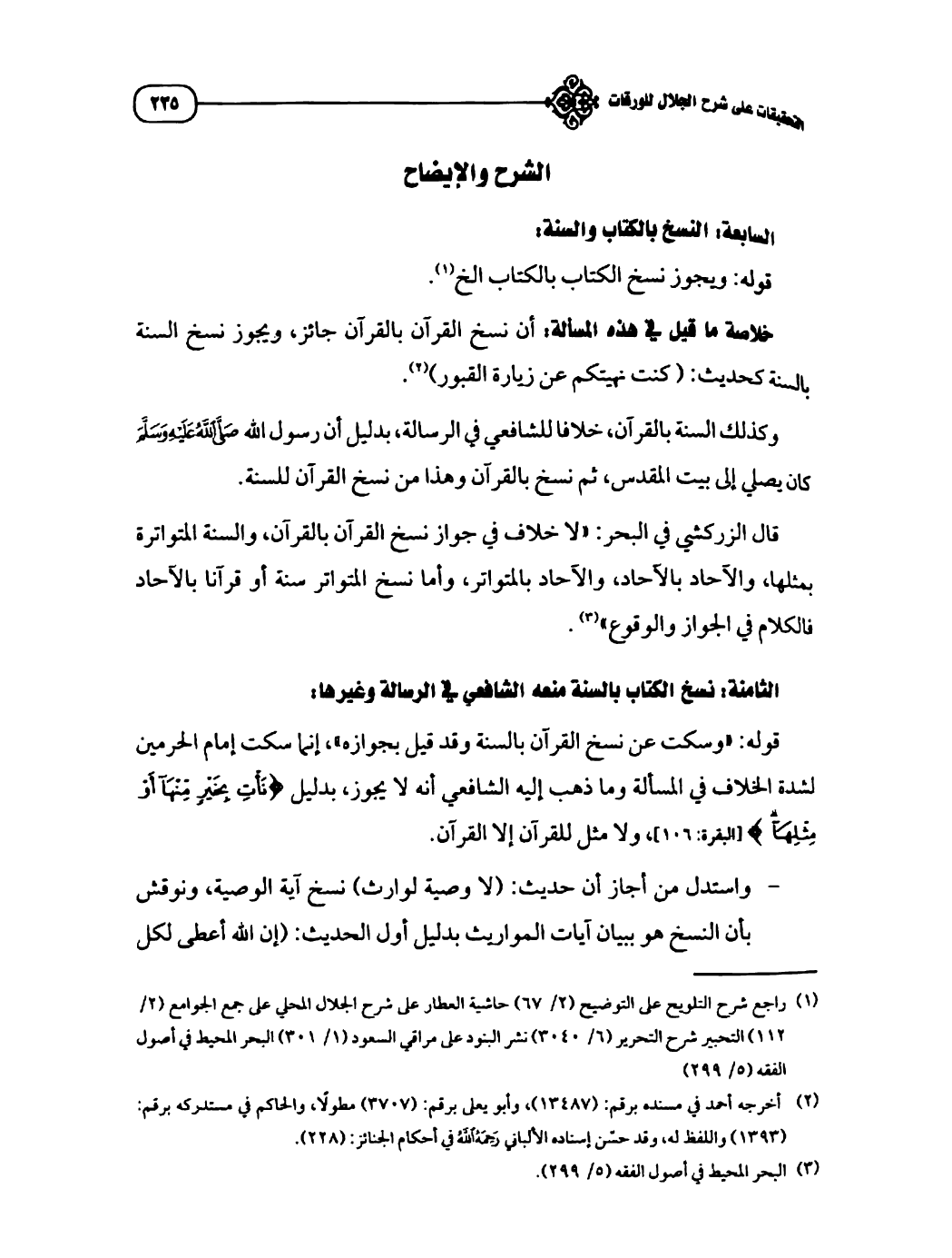 (¬١) راجع شرح التلويح على التوضيح (٢/ ٦٧) حاشية العطار على شرح الجلال المحلي على جمع الجوامع (٢/ ١١٢) التحبير شرح التحرير (٦/ ٣٠٤٠) نشر البنود على مراقي السعود (١/ ٣٠١) البحر المحيط في أصول الفقه (٥/ ٢٩٩)