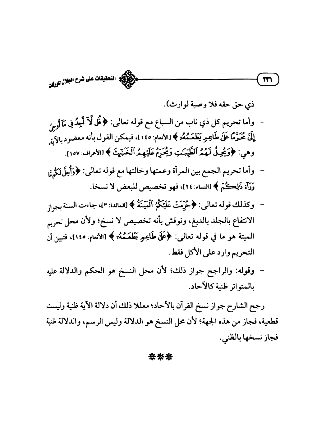 رجح الشارح جواز نسخ القرآن بالآحاد؛ معللا ذلك أن دلالة الآية ظنية وليست قطعية، فجاز من هذه الجهة؛ لأن محل النسخ هو الدلالة وليس الرسم، والدلالة ظنية فجاز نسخها بالظني.