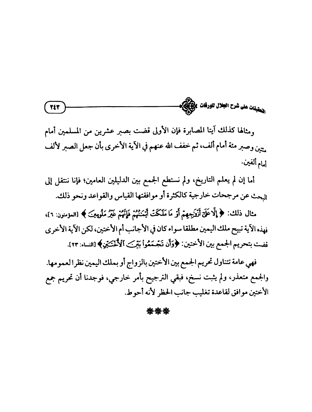 مثال ذلك: {إِلَّا عَلَى أَزْوَاجِهِمْ أَوْ مَا مَلَكَتْ أَيْمَانُهُمْ فَإِنَّهُمْ غَيْرُ مَلُومِينَ} [المؤمنون: ٦]، فهذه الآية تبيح ملك اليمين مطلقا سواء كان في الأجانب أم الأختين، لكن الآية الأخرى قضت بتحريم الجمع بين الأختين: {وَأَنْ تَجْمَعُوا بَيْنَ الْأُخْتَيْنِ} [النساء: ٢٣].