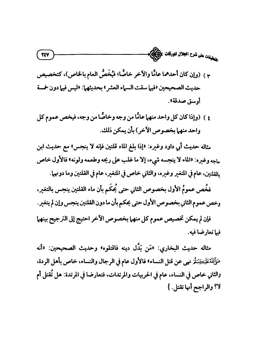 ٤_ وإن كان كل واحد منهما عاماً من وجه وخاصاً من وجه، فيخص عموم كل واحد منهما بخصوص الآخر بأن يمكن ذلك: مثاله حديث أبي داود وغيره: (إذا بلغ الماء قلتين فإنه لا ينجس) مع حديث ابن ماجة وغيره: (الماء لا ينجسه شيء إلا ما غلب على ريحه وطعمه ولونه).