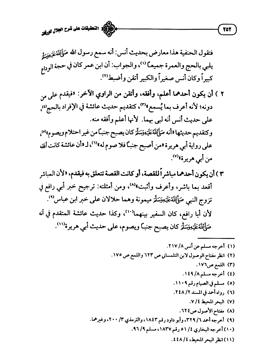 فتقول الحنفية هذا معارض بحديث أنس: أنه سمع رسول الله صلى الله عليه وسلم يلبي بالحج والعمرة جميعاً (¬١)، والجواب: أن ابن عمر كان في حجة الوداع كبيراً وكان أنس صغيراً والكبير أتقن وأضبط (¬٢).