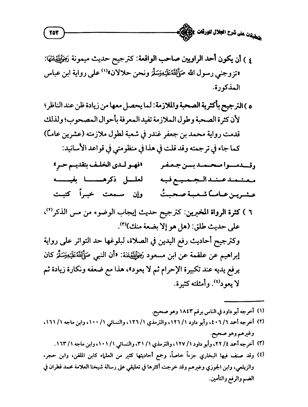 ٤. أن يكون أحد الراويين صاحب الواقعة: كترجيح حديث ميمونة رضي الله عنها: "تزوجني رسول الله صلى الله عليه وسلم ونحن حلالان" (¬١) على رواية ابن عباس المذكورة.