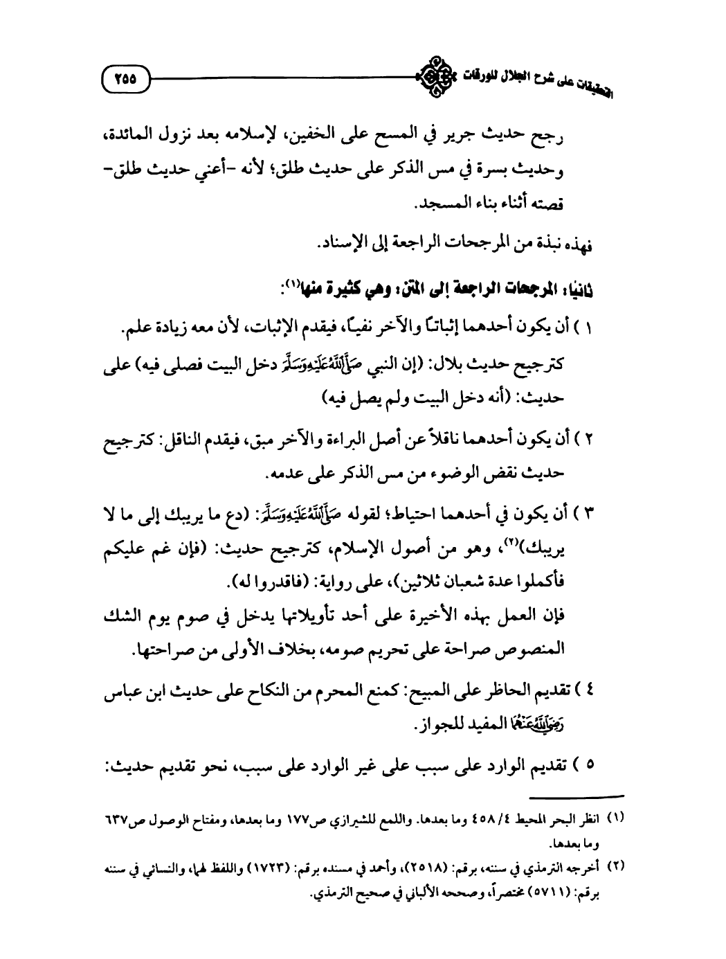 رجح حديث جرير في المسح على الخفين، لإسلامه بعد نزول المائدة، وحديث بسرة في مس الذكر على حديث طلق؛ لأنه أعنى حديث طلق قصته أثناء بناء المسجد.