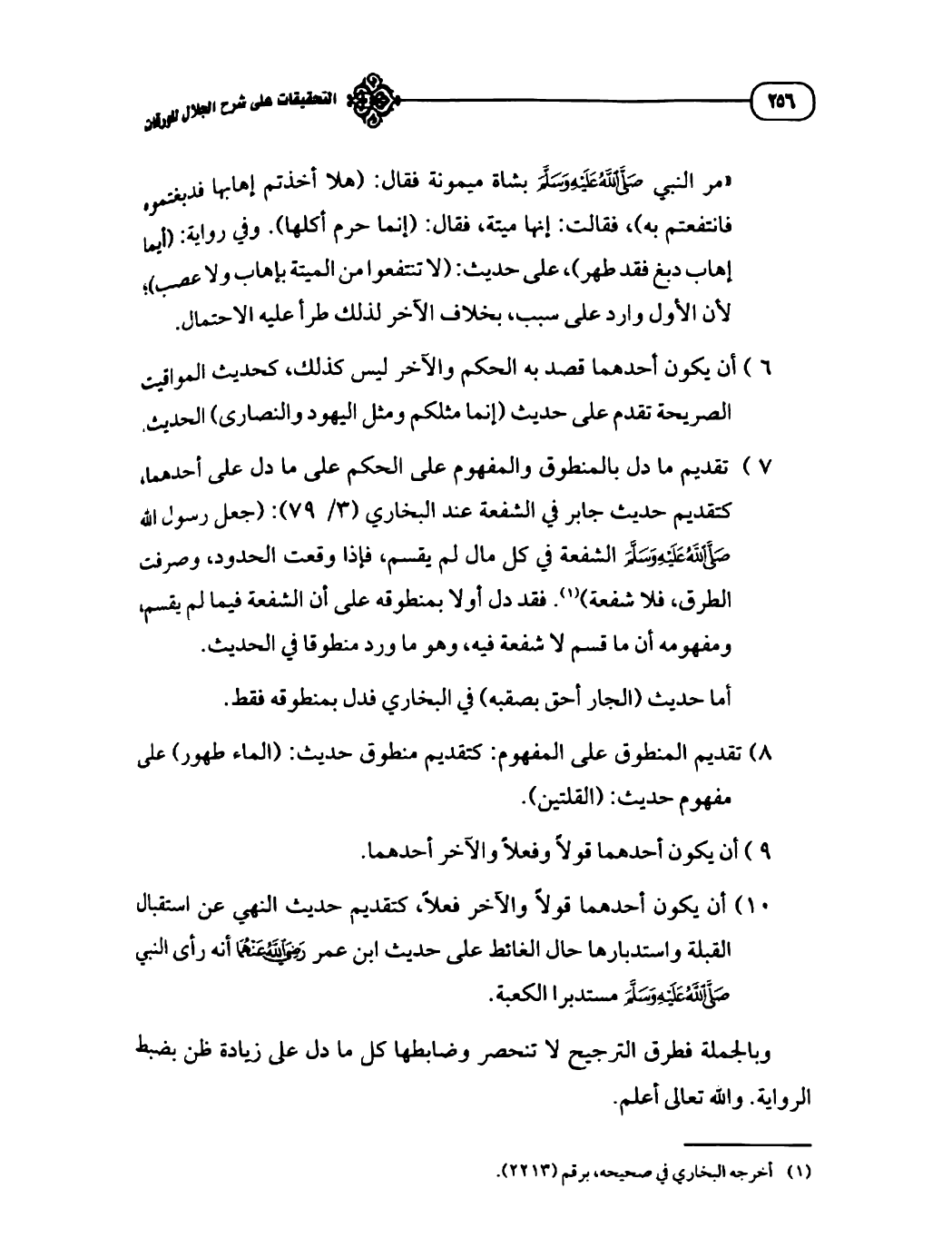 ٧ - تقديم ما دل بالمنطوق والمفهوم على الحكم على ما دل على أحدهما، كتقديم حديث جابر في الشفعة عند البخاري (٣/ ٧٩): (جعل رسول الله صلى الله عليه وسلم الشفعة في كل مال لم يقسم، فإذا وقعت الحدود، وصرفت الطرق، فلا شفعة) (¬١). فقد دل أولا بمنطوقه على أن الشفعة فيما لم يقسم، ومفهومه أن ما قسم لا شفعة فيه، وهو ما ورد منطوقا في الحديث.