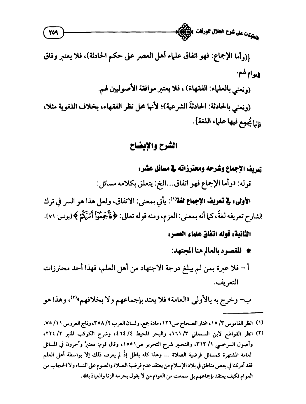 وأما الإجماع فهو اتفاق علماء أهل العصر على حكم الحادثة فلا يعتبر وفاق العوام لهم. ونعني بالعلماء الفقهاء فلا يعتبر موافقة الأصوليين لهم.