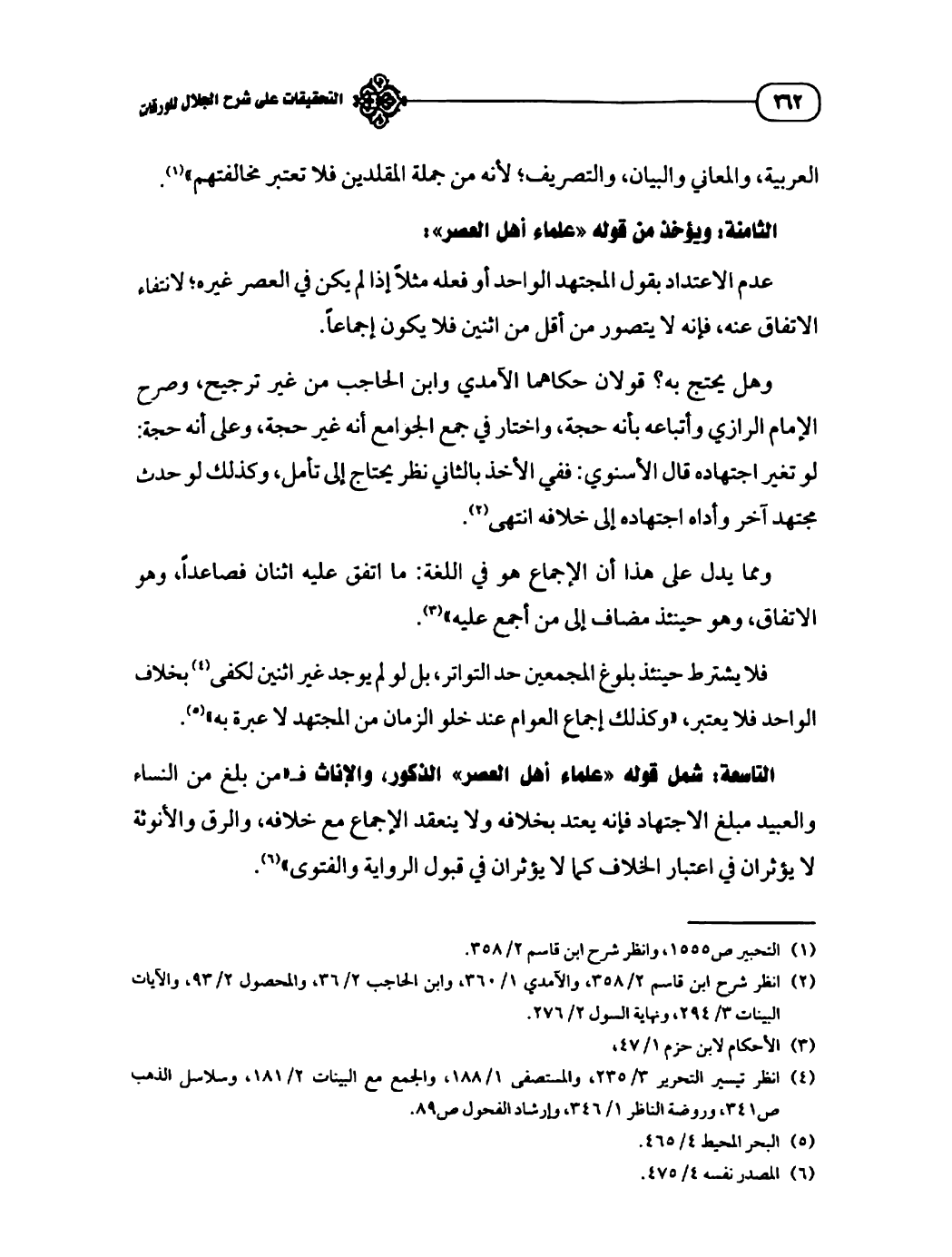 التاسعة: شمل قوله "علماء أهل العصر" الذكور، والإناث فـ"من بلغ من النساء والعبيد مبلغ الاجتهاد فإنه يعتد بخلافه ولا ينعقد الإجماع مع خلافه، والرق والأنوثة لا يؤثران في اعتبار الخلاف كما لا يؤثران في قبول الرواية والفتوى" (¬٦).