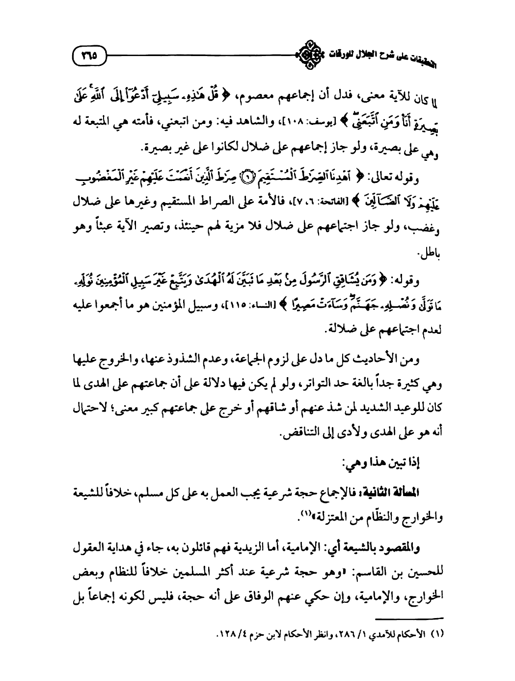 المسألة الثانية: فالإجماع حجة شرعية يجب العمل به على كل مسلم، خلافاً للشيعة والخوارج والنظّام من المعتزلة" (¬١).