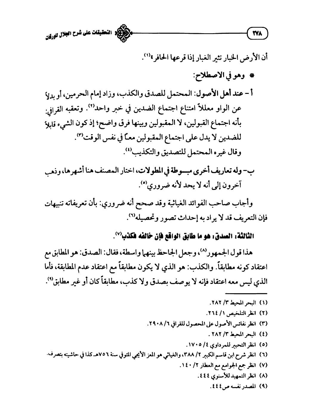 أ- عند أهل الأصول: المحتمل للصدق والكذب، وزاد إمام الحرمين، أو بدلاً عن الواو معللاً امتناع اجتماع الضدين في خبر واحد (¬٢). وتعقبه القرافي: بأنه اجتماع القبولين، لا المقبولين وبينها فرق واضح؛ إذ كون الشيء قابلاً للضدين لا يدل على اجتماع المقبولين معاً في نفس الوقت (¬٣).