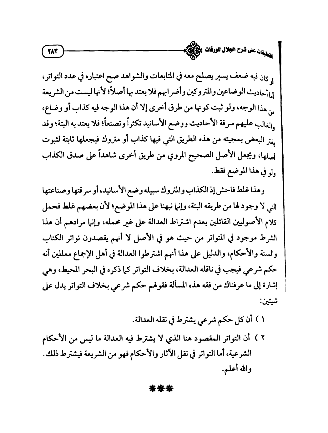 ٢ - أن التواتر المقصود هنا الذي لا يشترط فيه العدالة ما ليس من الأحكام الشرعية، أما التواتر في نقل الآثار والأحكام فهو من الشريعة فيشترط ذلك. والله أعلم.