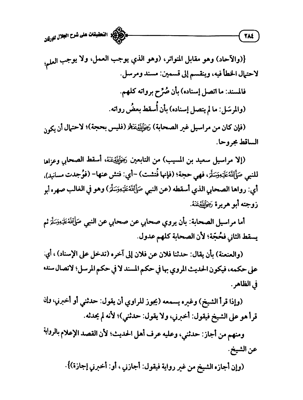 والعنعنة بأن يقال حدثنا فلان عن فلان إلى آخره، تدخل على الإسناد، أي على حكمه فيكون الحديث المروي بها في حكم المسند، لا المرسل لاتصال سنده في الظاهر.