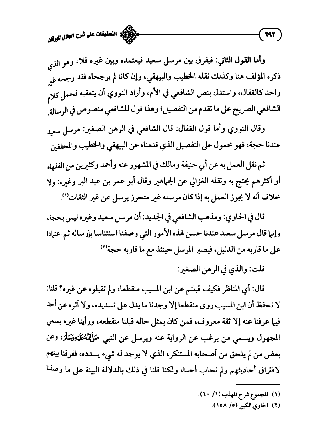 وقال النووي وأما قول القفال: قال الشافعي في الرهن الصغير: مرسل سعيد عندنا حجة، فهو محمول على التفصيل الذي قدمناه عن البيهقي والخطيب والمحققين.