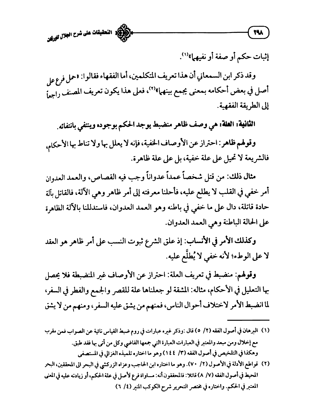 الثانية: العلة: هي وصف ظاهر منضبط يوجد الحكم بوجوده وينتفي بانتفائه.