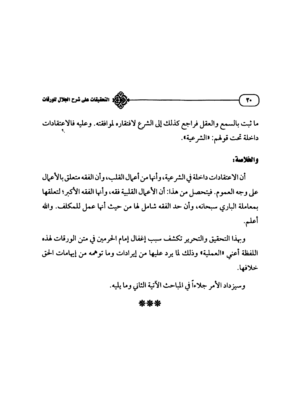 وبهذا التحقيق والتحرير تكشف سبب إغفال إمام الحرمين في متن الورقات لهذه اللفظة أعني "العملية" وذلك لما يرد عليها من إيرادات وما توهمه من إيهامات الحق خلافها.