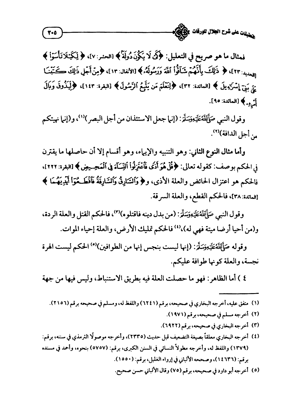 فمثال ما هو صريح في التعليل: {كَيْ لا يَكُونَ دُولَةً} [الحشر: ٧]، {لِكَيْلَا تَأْسَوْا} [الحديد: ٢٣]، {ذَلِكَ بِأَنَّهُمْ شَاقُّوا اللَّهَ وَرَسُولَهُ} [الأنفال: ١٣]، {مِنْ أَجْلِ ذَلِكَ كَتَبْنَا عَلَى بَنِي إِسْرَائِيلَ} [المائدة: ٣٢]، {لِنَعْلَمَ مَنْ يَتَّبِعُ الرَّسُولَ} [البقرة: ١٤٣]، {لِيَذُوقَ وَبَالَ أَمْرِهِ} [المائدة: ٩٥].