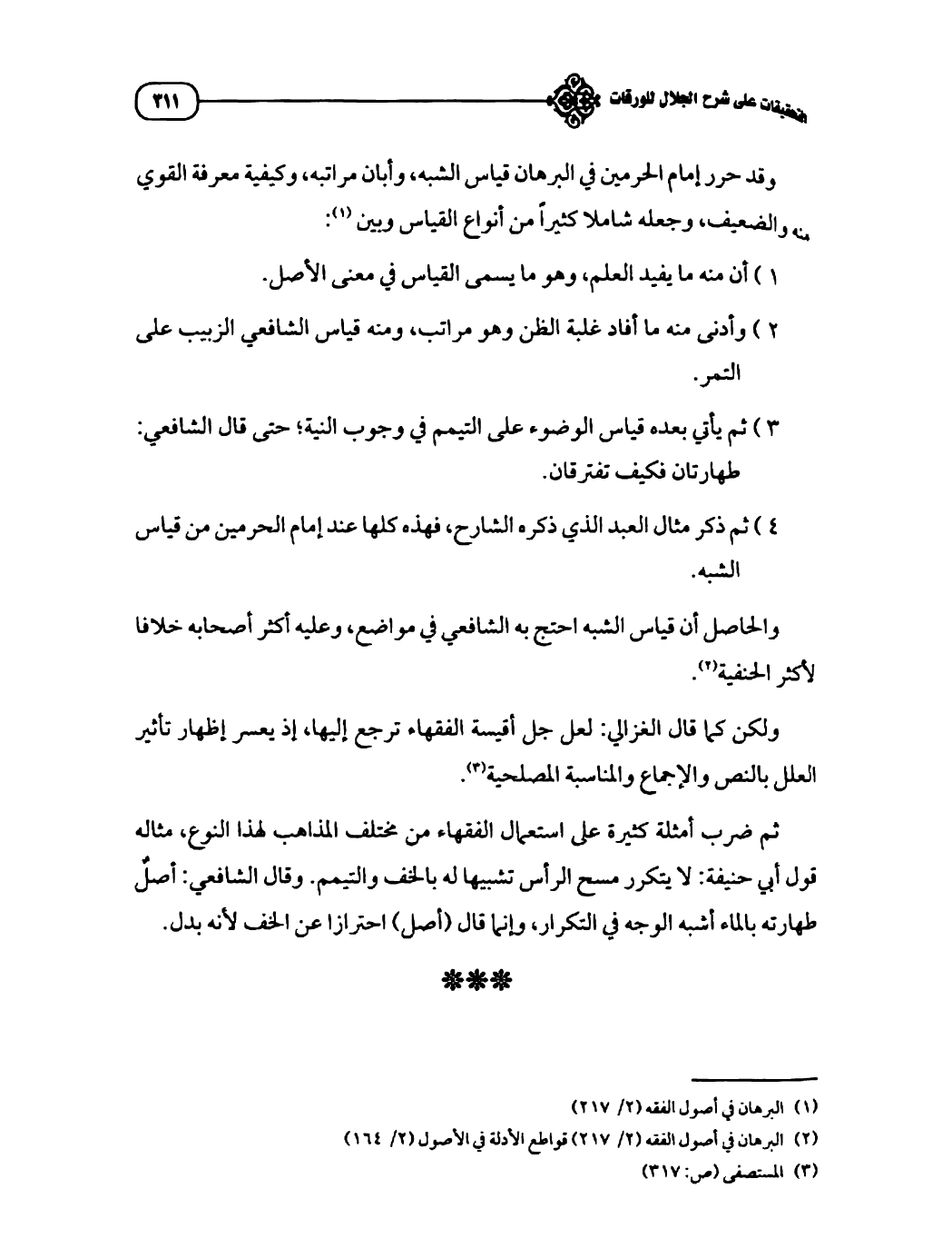 وقد حرر إمام الحرمين في البرهان قياس الشبه، وأبان مراتبه، وكيفية معرفة القوي منه والضعيف، وجعله شاملا كثير من أنواع القياس وبين (¬١):