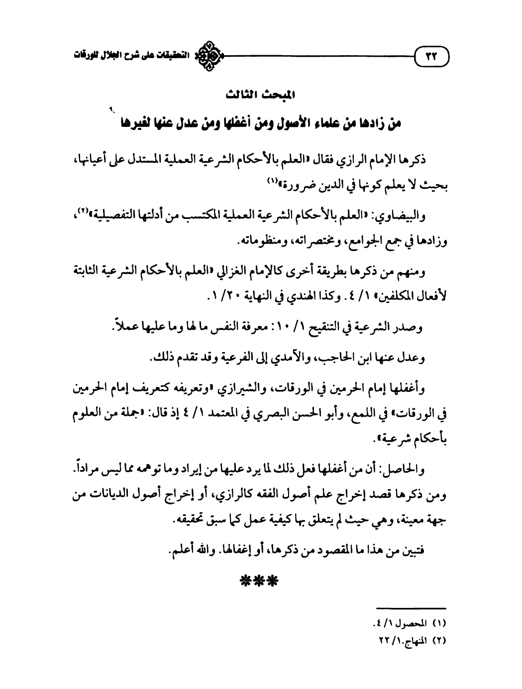 وأغفلها إمام الحرمين في الورقات، والشيرازي "وتعريفه كتعريف إمام الحرمين في الورقات" في اللمع، وأبو الحسن البصري في المعتمد ١/ ٤ إذ قال: "جملة من العلوم بأحكام شرعية".
