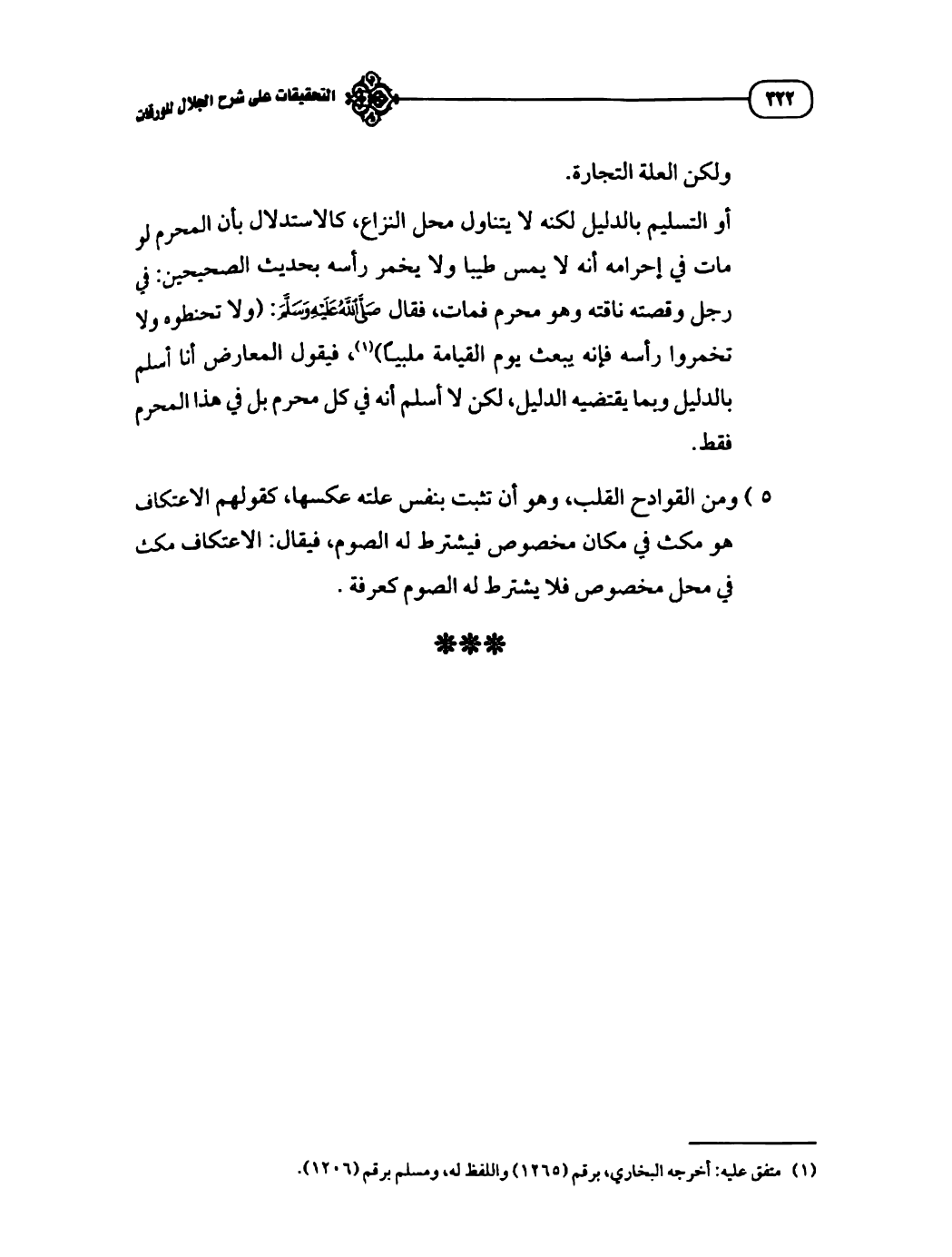 أو التسليم بالدليل لكنه لا يتناول محل النزاع، كالاستدلال بأن المحرم لو مات في إحرامه أنه لا يمس طيبا ولا يخمر رأسه بحديث الصحيحين: في رجل وقصته ناقته وهو محرم فمات، فقال صلى الله عليه وسلم: (ولا تحنطوه ولا تخمروا رأسه فإنه يبعثيوم القيامة ملبياً) (¬١)، فيقول المعارض أنا أسلم بالدليل وبما يقتضيه الدليل، لكن لا أسلم أنه في كل محرم بل في هذا المحرم فقط.