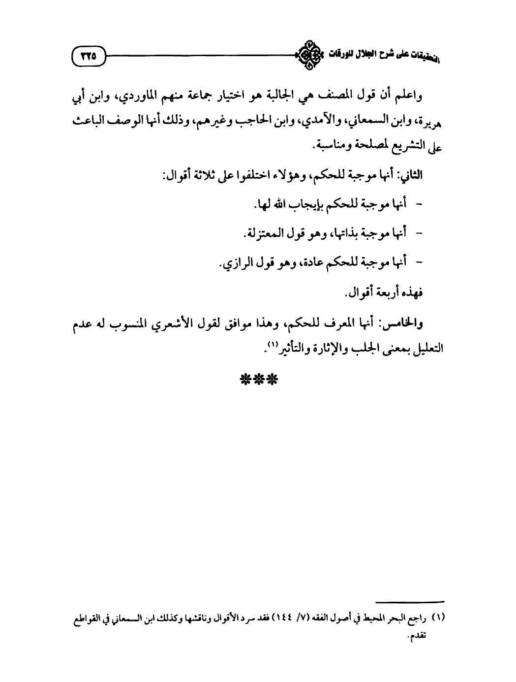 والخامس: أنها المعرف للحكم، وهذا موافق لقول الأشعري المنسوب له عدم التعليل بمعنى الجلب والإثارة والتأثير. (¬١)