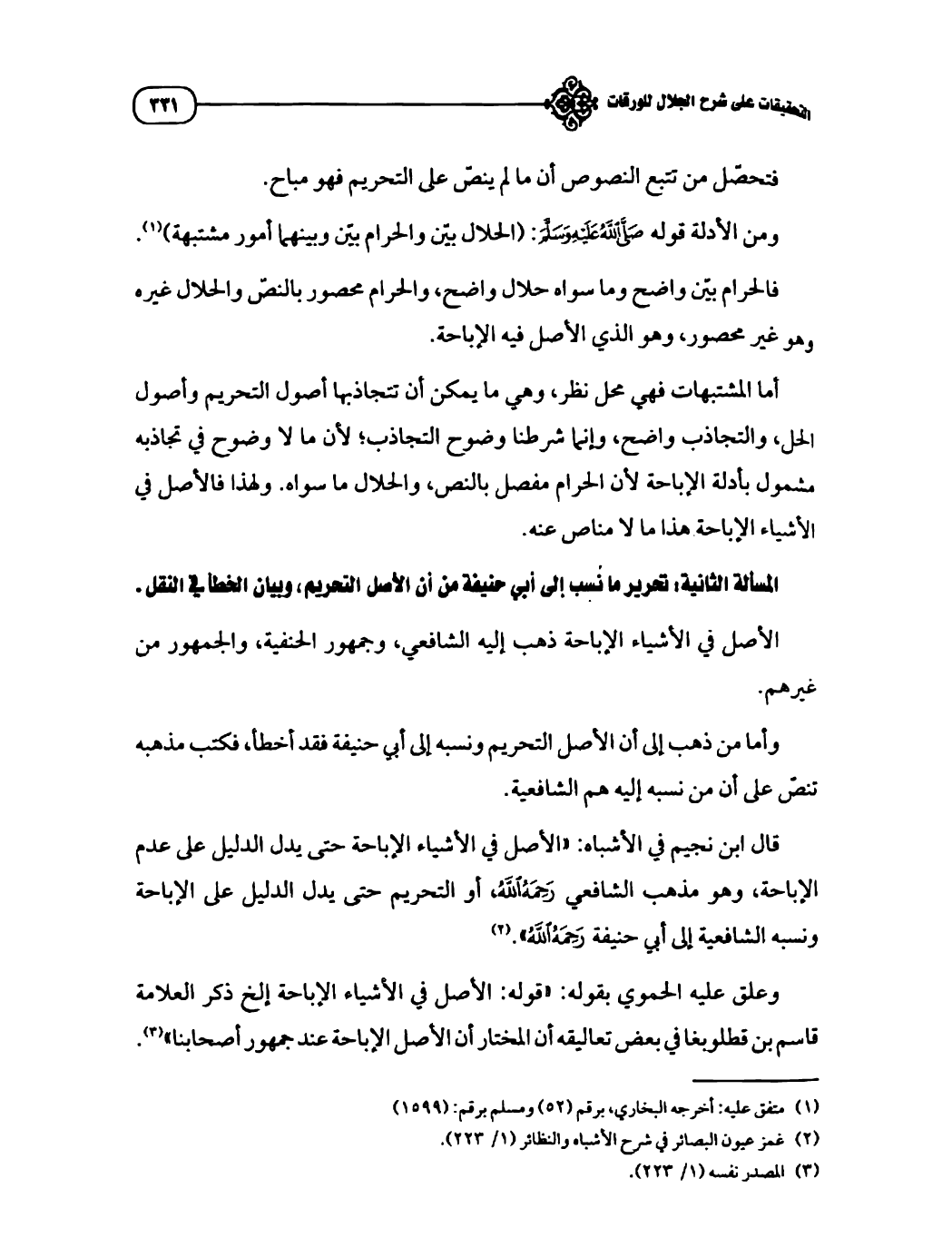 أما المشتبهات فهي محل نظر، وهي ما يمكن أن تتجاذبها أصول التحريم وأصول الحل، والتجاذب واضح، وإنما شرطنا وضوح التجاذب؛ لأن ما لا وضوح في تجاذبه مشمول بأدلة الإباحة لأن الحرام مفصل بالنص، والحلال ما سواه. ولهذا فالأصل في الأشياء الإباحة هذا ما لا مناص عنه.