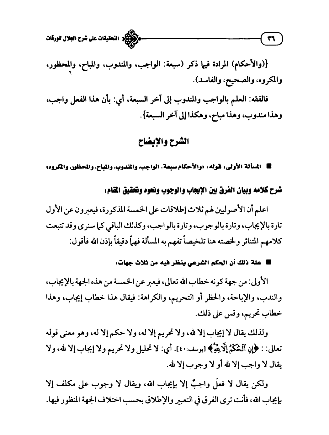ولذلك يقال لا إيجاب إلا لله، ولا تحريم إلا له، ولا حكم إلا له، وهو معنى قوله تعالى: {إِنْ الْحُكْمُ إِلَاّ لِلَّهِ} [يوسف: ٤٠]. أي: لا تحليل ولا تحريم ولا إيجاب إلا لله، ولا يقال لا واجب إلا لله أو لا وجوب إلا لله.
