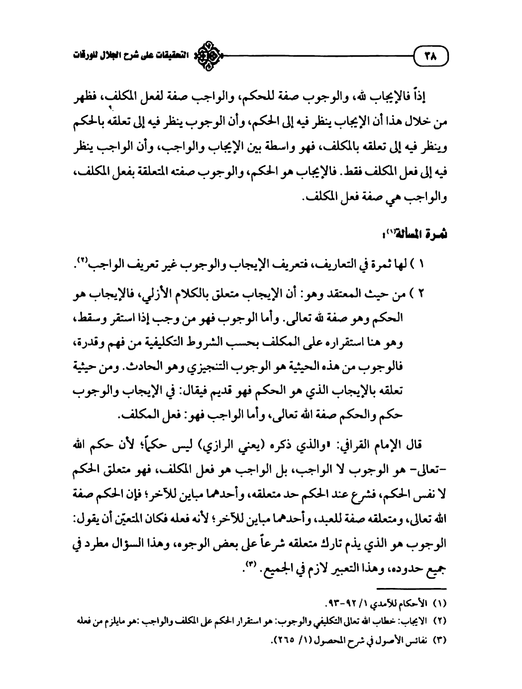 قال الإمام القرافي: "والذي ذكره (يعني الرازي) ليس حكماً؛ لأن حكم الله -تعالى- هو الوجوب لا الواجب، بل الواجب هو فعل المكلف، فهو متعلق الحكم لا نفس الحكم، فشرع عند الحكم حد متعلقه، وأحدهما مباين للآخر؛ فإن الحكم صفة الله تعالى، ومتعلقه صفة للعبد، وأحدهما مباين للآخر؛ لأنه فعله فكان المتعيّن أن يقول: الوجوب هو الذي يذم تارك متعلقه شرعاً على بعض الوجوه، وهذا السؤال مطرد في جميع حدوده، وهذا التعبير لازم في الجميع. (¬٣).