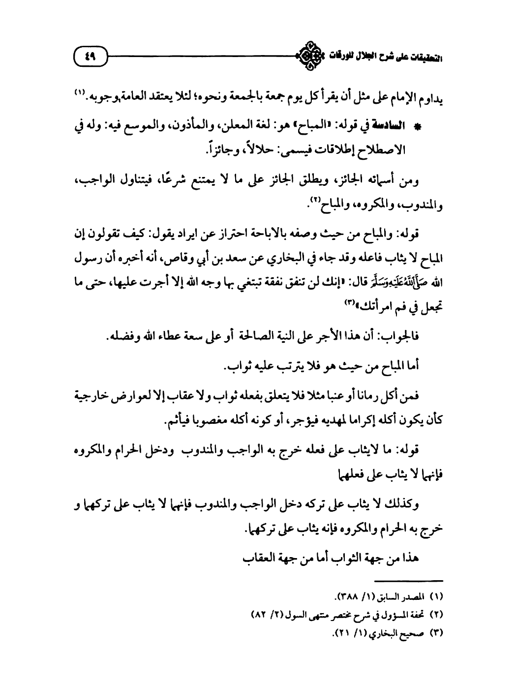 - السادسة في قوله: "المباح" هو: لغة المعلن، والمأذون، والموسع فيه.: وله في الاصطلاح إطلاقات فيسمى: حلالاً، وجائزاً.