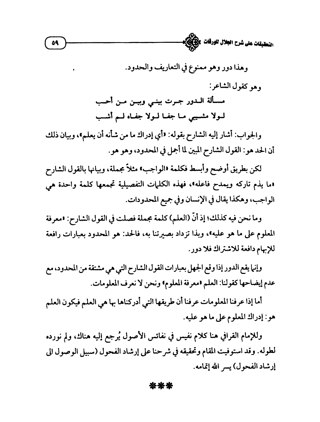 وإنما يقع الدور إذا وقع الجهل بعبارات القول الشارح التي هي مشتقة من المحدود، مع عدم إيضاحها كقولنا: العلم "معرفة المعلوم" ونحن لا نعرف المعلومات.